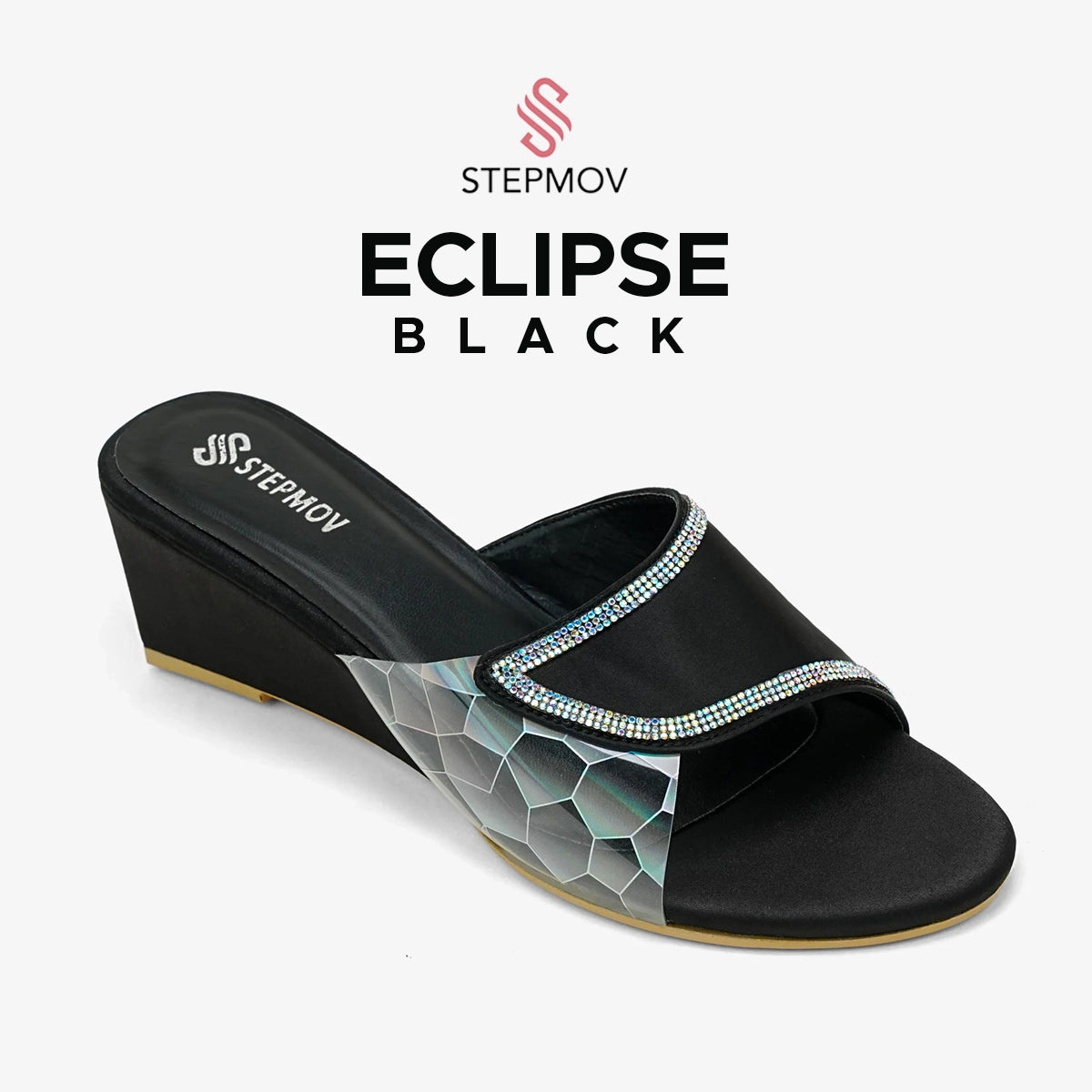 Upper: Black upper decorated with the sparkling strip on the border and one side with 3d texture on transparent material.